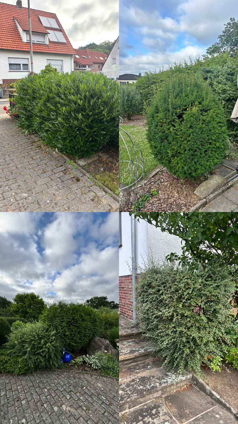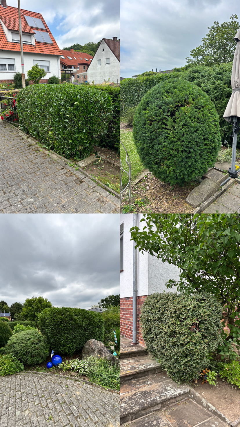 Nach fachgerechtem Rückschnitt präsentiert sich die Anlage gepflegt und harmonisch. Saubere Linien und definierte Formen unterstreichen die professionelle Gartenpflege.