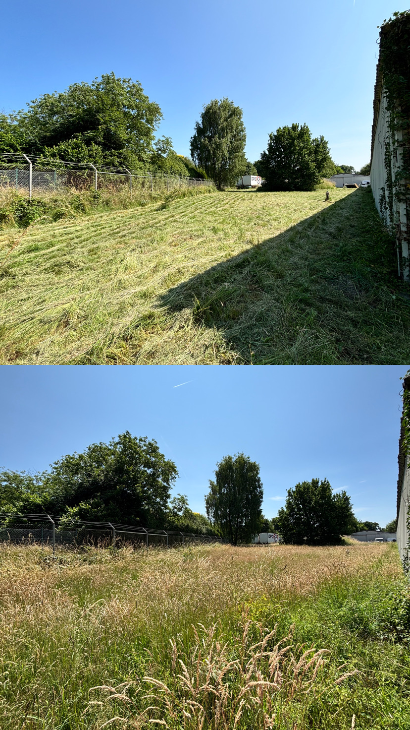 Die Grünanlagen zeigen sich vor Pflege noch unstrukturiert und naturbelassen. Ein klarer Rückschnitt sorgt hier im nächsten Schritt für ein gepflegtes Erscheinungsbild.